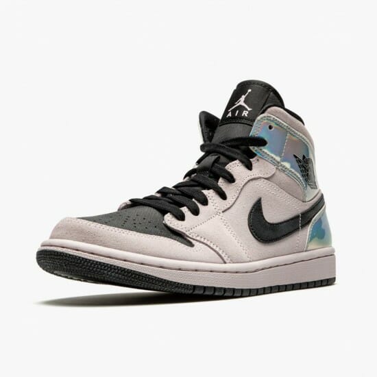 The Air Jordan 1 Mid “Iridescent” is a flashy look for the women’s sizing of Michael Jordan’s first signature shoe in mid-top form. The unique appearance of the release can be attributed to the iridescent leather collar and heel which emits a reflective shine. Barely Rose suede covers the mid-panel, toe cap, and collar. A dotted black nylon Swoosh contrasts the mid-panel. Additional black nylon appears on the perforated toe and tongue. Jordan Brand finishes off the midsole in a tonal hue that syncs with the pale pink suede base of the shoe.