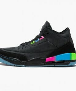 The Air Jordan 3 Retro Quai54 features a premium full-grain nubuck upper in black, which provides durability and style. The sneaker’s eye-catching accents in neon pink, green, and blue give it a unique look that captures the essence of streetball culture. The sneaker also features a Quai54 logo on the tongue, which adds to its exclusivity.