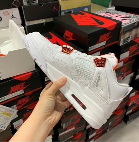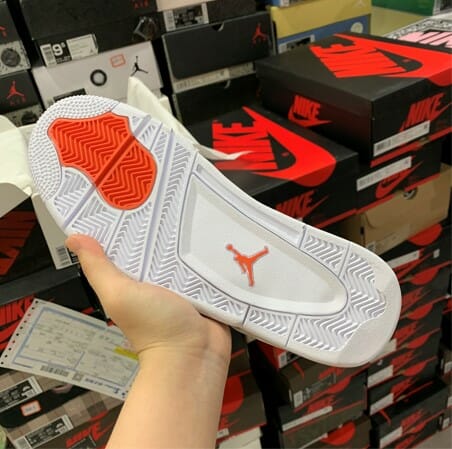 The upper of the Air Jordan 4 Orange Metallic is constructed of a premium leather and mesh material, providing both durability and breathability. The metallic accents on the eyelets and Jumpman logo add a touch of luxury, while the orange colorway provides a pop of boldness. The midsole is made of a lightweight foam material, providing cushioning and comfort, while the outsole is made of a durable rubber material with a herringbone pattern for traction and grip.