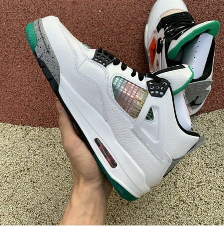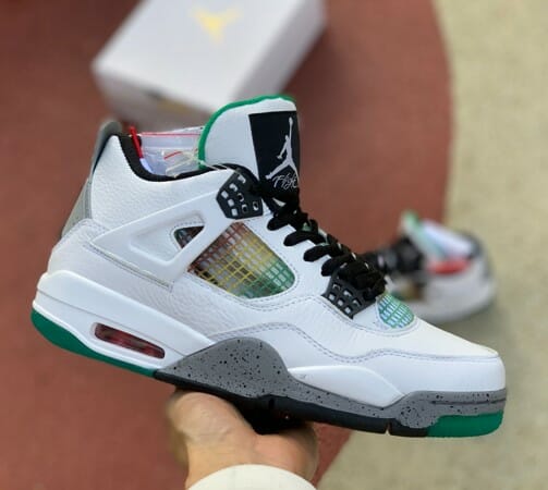 The Air Jordan 4 Rasta features a predominantly white leather upper with black accents on the eyelets and netting. The shoe’s standout feature is the Rasta colors on the Jumpman logo, tongue, and midsole. The combination of red, green, and yellow on the shoe gives it a fun and lively vibe.