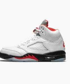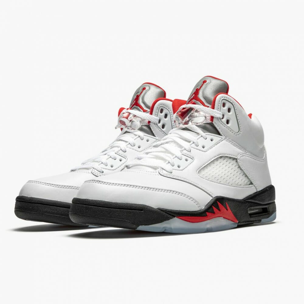 The Air Jordan 5 Retro “Fire Red Silver Tongue” is a Spring 2020 release of the original colorway of Michael Jordan’s fifth signature shoe. This version brings back the classic branding previously found on original 1990 releases of the model, that had since been replaced with a Jumpman logo on previous retros. Jordan Brand brings back many original styling elements of the shoe including a reflective silver tongue, black midsole with shark tooth detailing, and an icy translucent blue outsole. Premium white leather covers the upper, save for the clear mesh panel on the midfoot. Red Jumpman branding appears on the tongue and a true-to-original translucent lace lock assists in tying the laces together, just like it did back when Jordan famously wore the sneaker in the ‘90s.