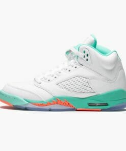 The Air Jordan 5 Retro “Light Aqua” received this fresh new look appropriate for the summer season. The children’s Air Jordan 5 “Light Aqua” features a clean white upper with aqua accents on the midsole and inner lining, while bright orange detailing and icy clear blue portions of the outsole complete the refreshing color palette. The result is a decidedly tropical look. Produced only in children’s sizing, the appealing look of the Air Jordan 5 “Light Aqua” left many adult collectors wishing that they could get their own pair.