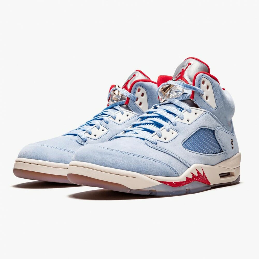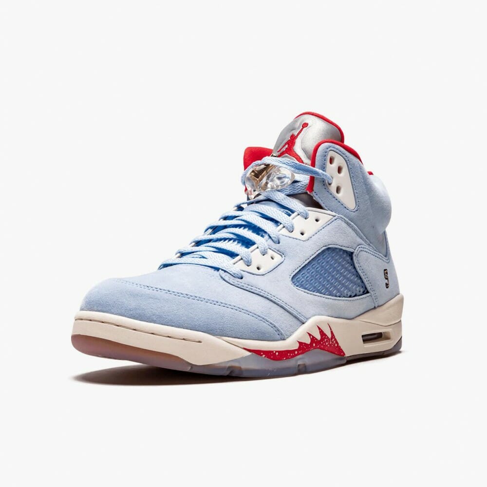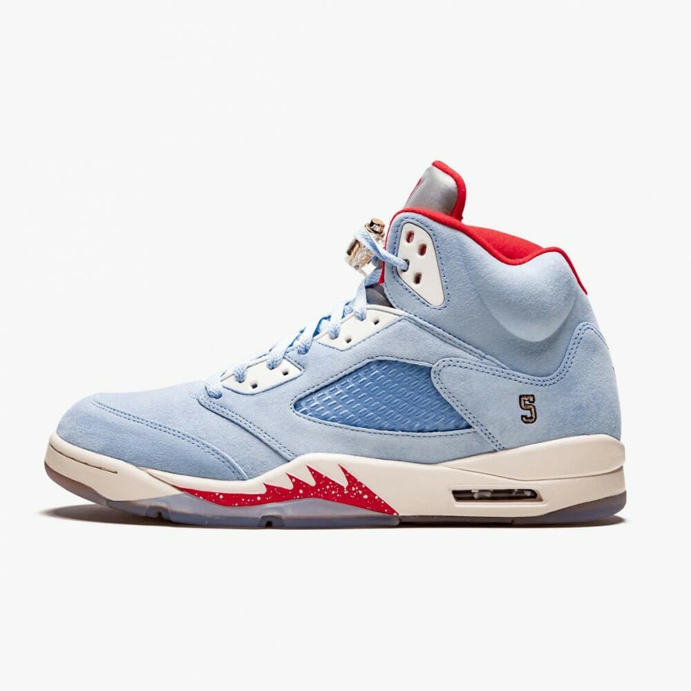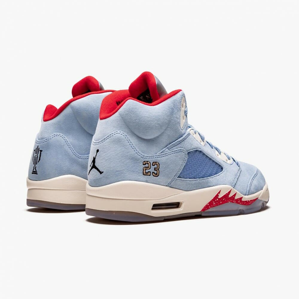 The Air Jordan 5 Retro Trophy Room “Ice Blue” is a limited edition colorway of the iconic silhouette by the boutique owned by Michael Jordan’s son, Marcus. The unique colorway is inspired by Michael Jordan’s trophy room, which was an important part of the Jordan family house that Marcus grew up in. The Jordan 5 features an Ice Blue suede upper with red and Sail accents across the upper and midsole. Hits of metallic gold appear on the lace lock and on the “5” and “23” numerals embroidered on each heel. A traditional reflective silver tongue and Trophy Room and Jumpman logos on opposite heels complete the upper. The full-length clear rubber outsole reveals a wood floor graphic beneath it, a reference to the basketball court-style floor of Jordan’s trophy room. For one final special detail, each pair also features cork insoles.