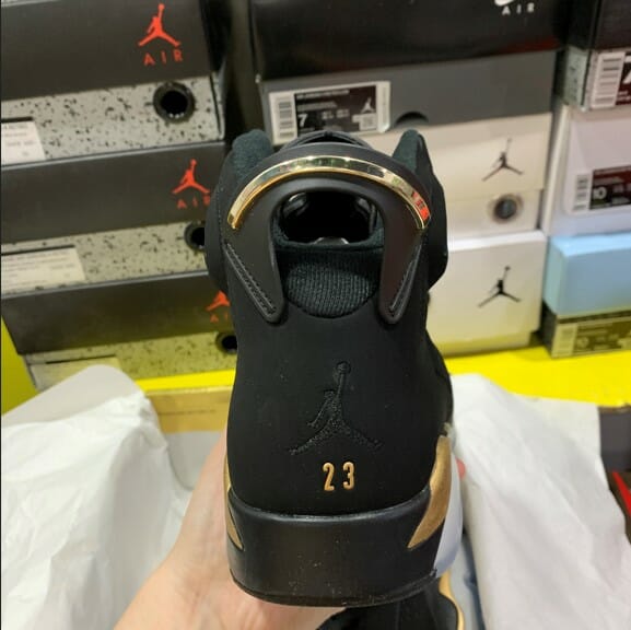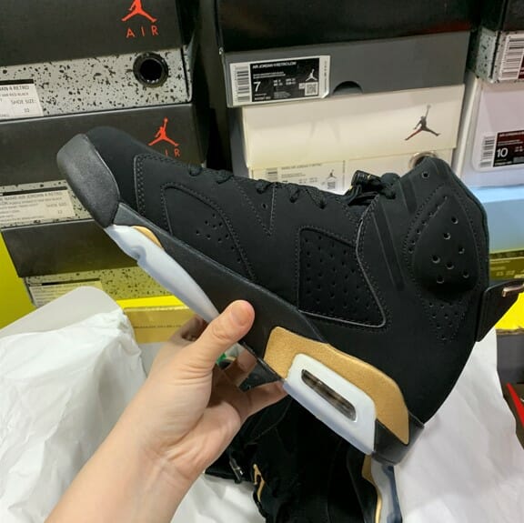 The Air Jordan 6 DMP Retro is an iconic shoe that features a black and gold colorway. The upper is made of black suede, while the midsole and outsole are covered in gold accents. The shoe also includes a metallic Jumpman logo on the heel and a “23” emblem on the lace lock.