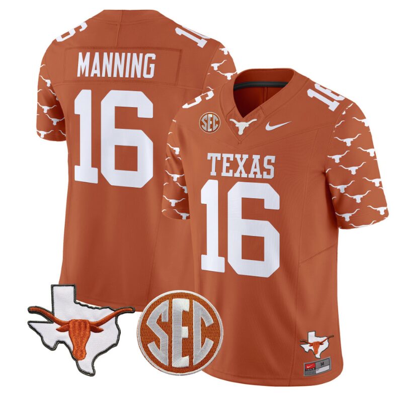 Arch Manning Jersey #16 Texas Longhorns State Map and Sec Patch Vapor Limited College Football Stitched Texas Orange