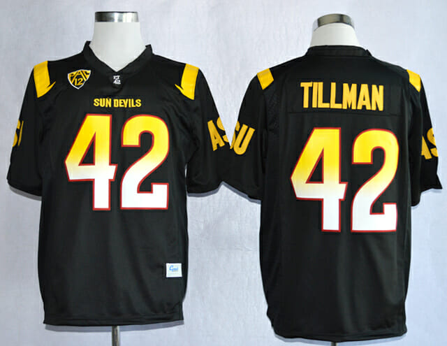 Celebrate your football fandom with this ncaa football jersey ! This Arizona State Sun Devils #42 Pat Tillman NCAA Football Jersey Black With Patch is available in various size men, women and youth and features a combination of stitched-embroidery. You’ll look just like your favorite ncaa football players when you rock this ncaa football jersey!