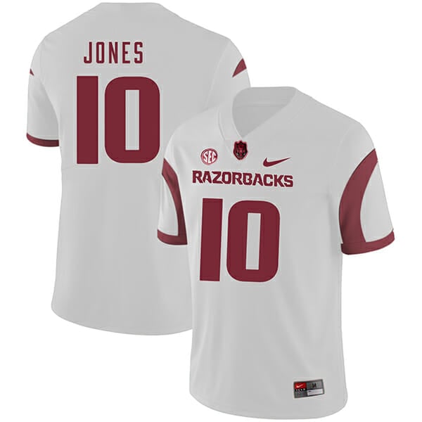 Celebrate your football fandom with this ncaa football jersey ! This Arkansas Razorbacks #10 Jordan Jones College Football Jersey White is available in various size men, women and youth and features a combination of stitched-embroidery. You’ll look just like your favorite ncaa football players when you rock this ncaa football jersey!