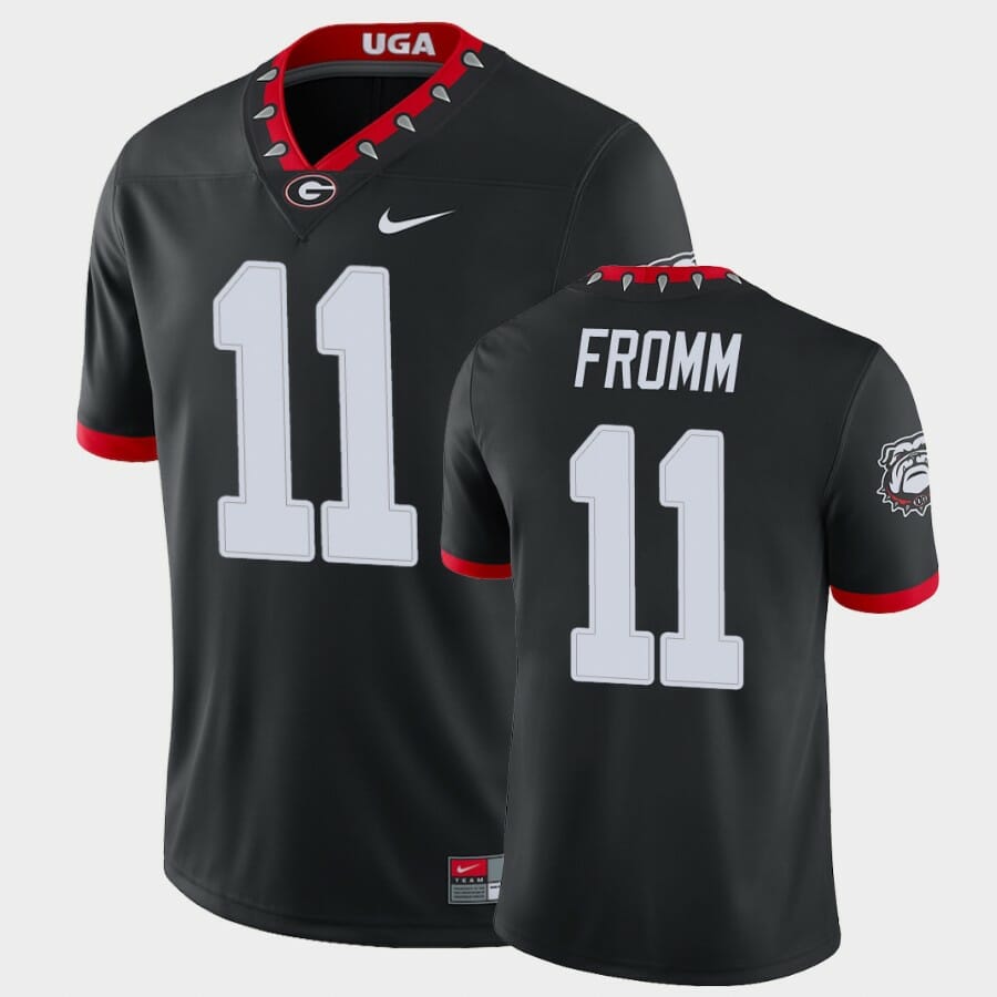 Celebrate your football fandom with this ncaa football jersey ! This Georgia Bulldogs #11 Jake Fromm Black College Football Alternate Game Jersey is available in various size men, women and youth and features a combination of stitched-embroidery. You’ll look just like your favorite ncaa football players when you rock this ncaa football jersey!