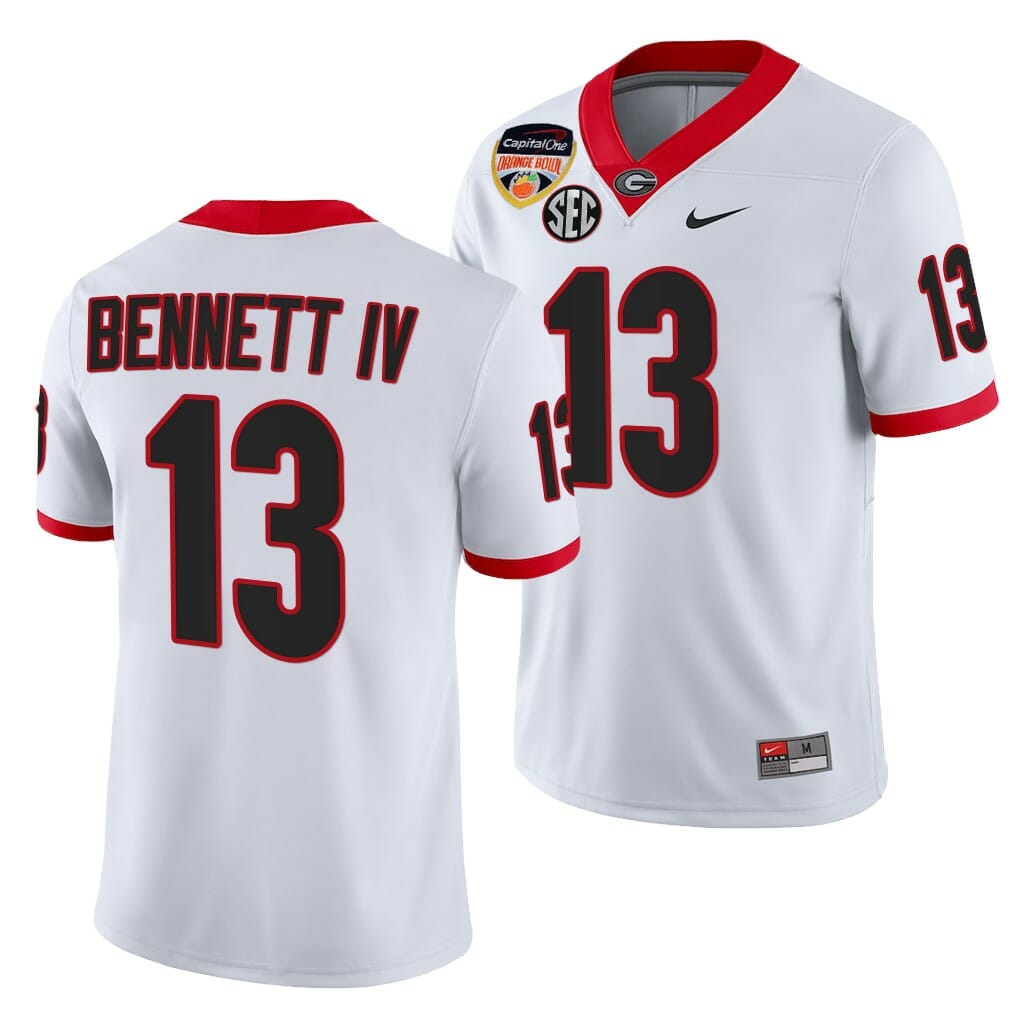 The Georgia Bulldogs #13 Stetson Bennett Jersey 2021 Orange Bowl White 100th Anniversary feature stitched embroidery and are available in a variety of sizes for men, women and youth. Show off your football fandom with this NCAA college football jersey! This NCAA college football Stetson Bennett Jersey will make you look like your favorite NCAA college football players!