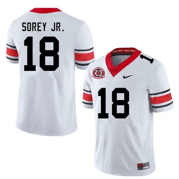 Celebrate your football fandom with this ncaa football jersey ! This Georgia Bulldogs #18 Xavian Sorey Jr. Game NCAA College Football Jersey White is available in various size men, women and youth and features a combination of stitched-embroidery. You’ll look just like your favorite ncaa football players when you rock this ncaa football jersey!