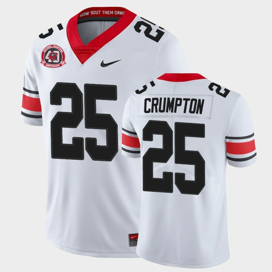 Celebrate your football fandom with this ncaa football jersey ! This Georgia Bulldogs #25 Ahkil Crumpton White College Football 40th Anniversary Alternate Jersey is available in various size men, women and youth and features a combination of stitched-embroidery. You’ll look just like your favorite ncaa football players when you rock this ncaa football jersey!