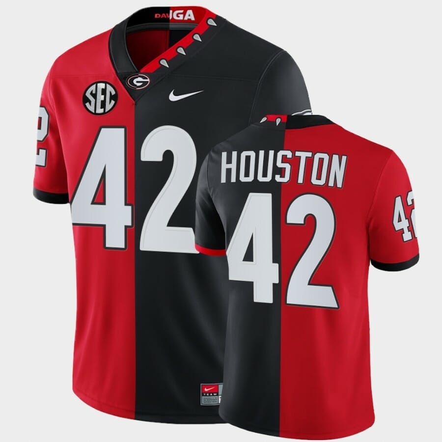 Celebrate your football fandom with this ncaa football jersey ! This Georgia Bulldogs #42 Justin Houston Red Black Split Edition 100th Season Alumni Jersey is available in various size men, women and youth and features a combination of stitched-embroidery. You’ll look just like your favorite ncaa football players when you rock this ncaa football jersey!