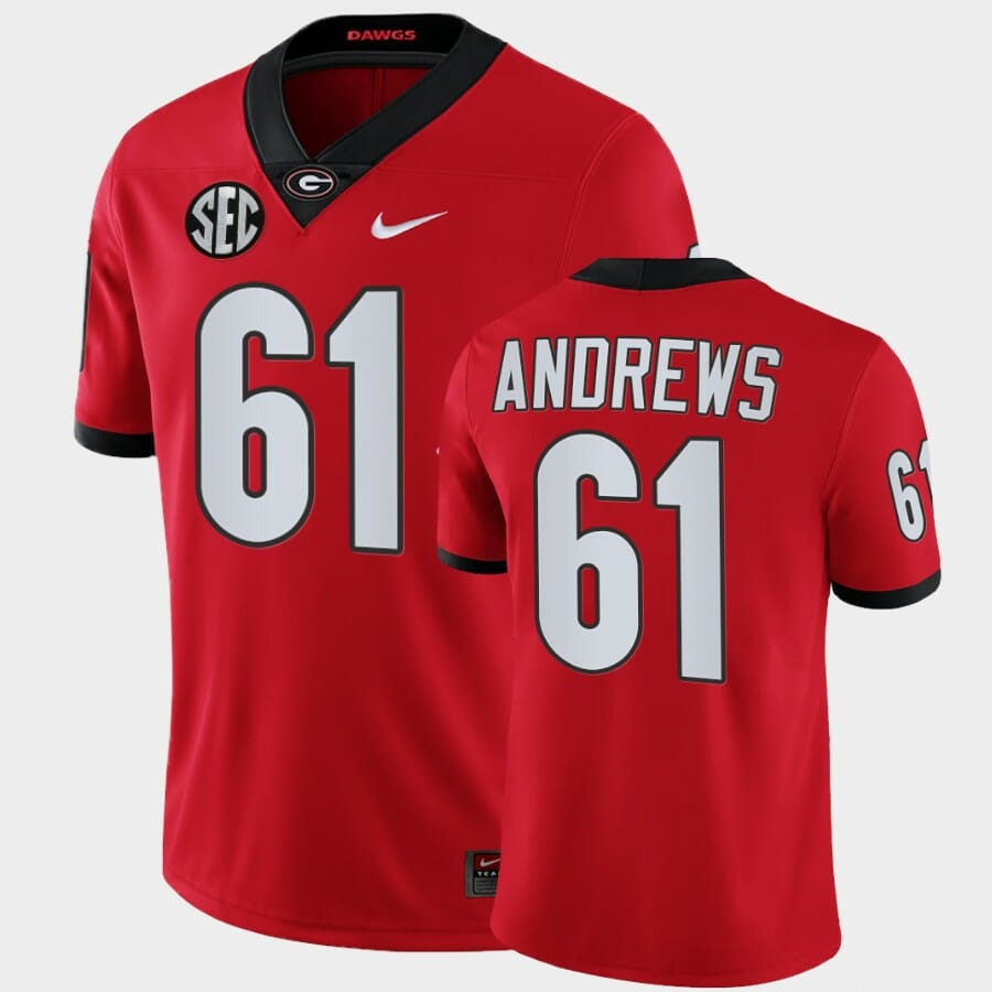 Celebrate your football fandom with this ncaa football jersey ! This Georgia Bulldogs #61 David Andrews Red College Football Alumni Jersey is available in various size men, women and youth and features a combination of stitched-embroidery. You’ll look just like your favorite ncaa football players when you rock this ncaa football jersey!