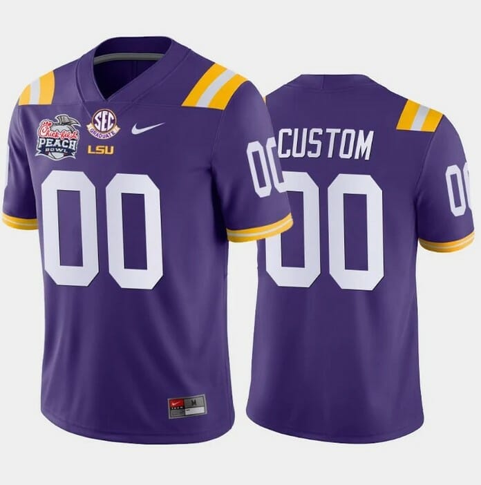 The Lsu Jersey Personalized Purple 2019-20 Away Peach Bowl Champions College Football Jersey feature stitched embroidery and are available in a variety of sizes for men, women and youth. Show off your football fandom with this NCAA college custom football jersey! This NCAA football lsu jersey personalized will make you look like your favorite NCAA college football players!