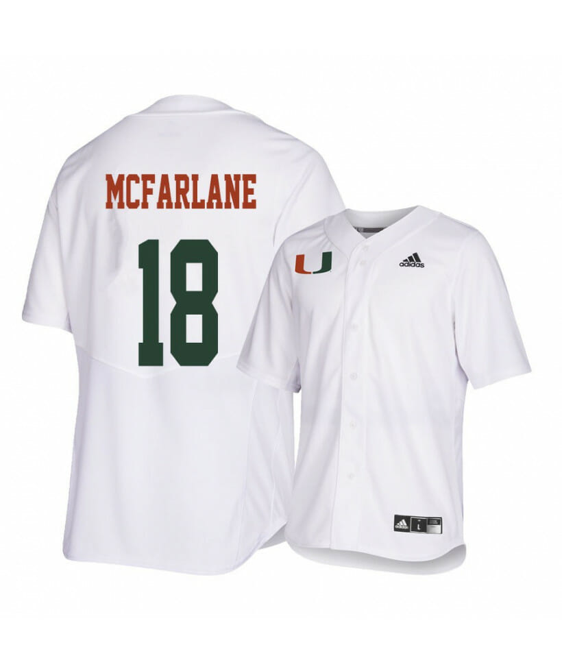 Make sure you are ready to celebrate another baseball team victory on game day! This Miami Hurricanes 18 Alex Mcfarlane White College Baseball Jersey is available in various size and gender men, women, and youth baseball jersey size and is a perfect way to let you join in on the fun. It boasts quality team colors and graphics so you can feel just like a true baseball team and show off your fandom!