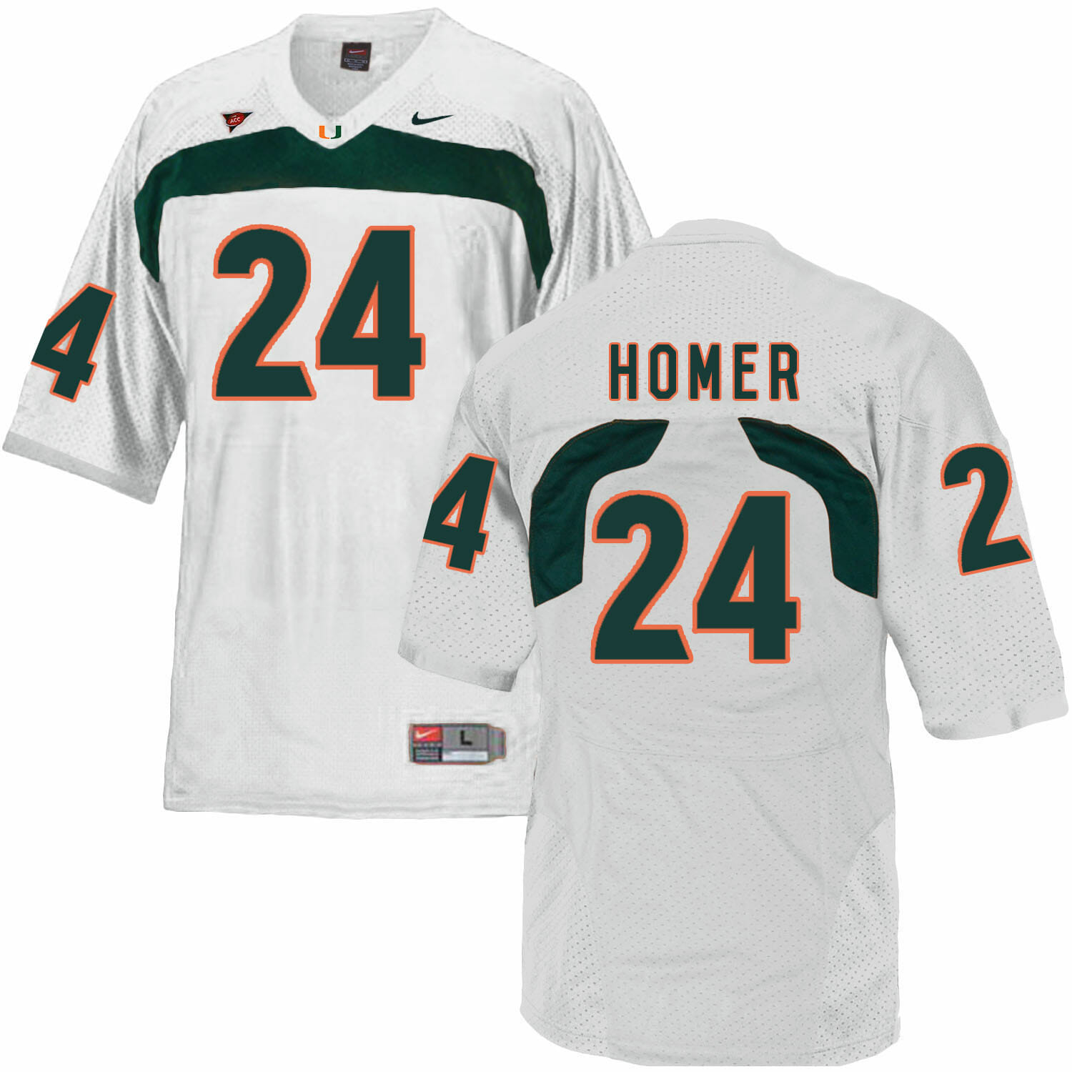 Celebrate your football fandom with this ncaa football jersey ! This Miami Hurricanes #24 Homer NCAA College Football Jersey White is available in various size men, women and youth and features a combination of stitched-embroidery. You’ll look just like your favorite ncaa football players when you rock this ncaa football jersey!