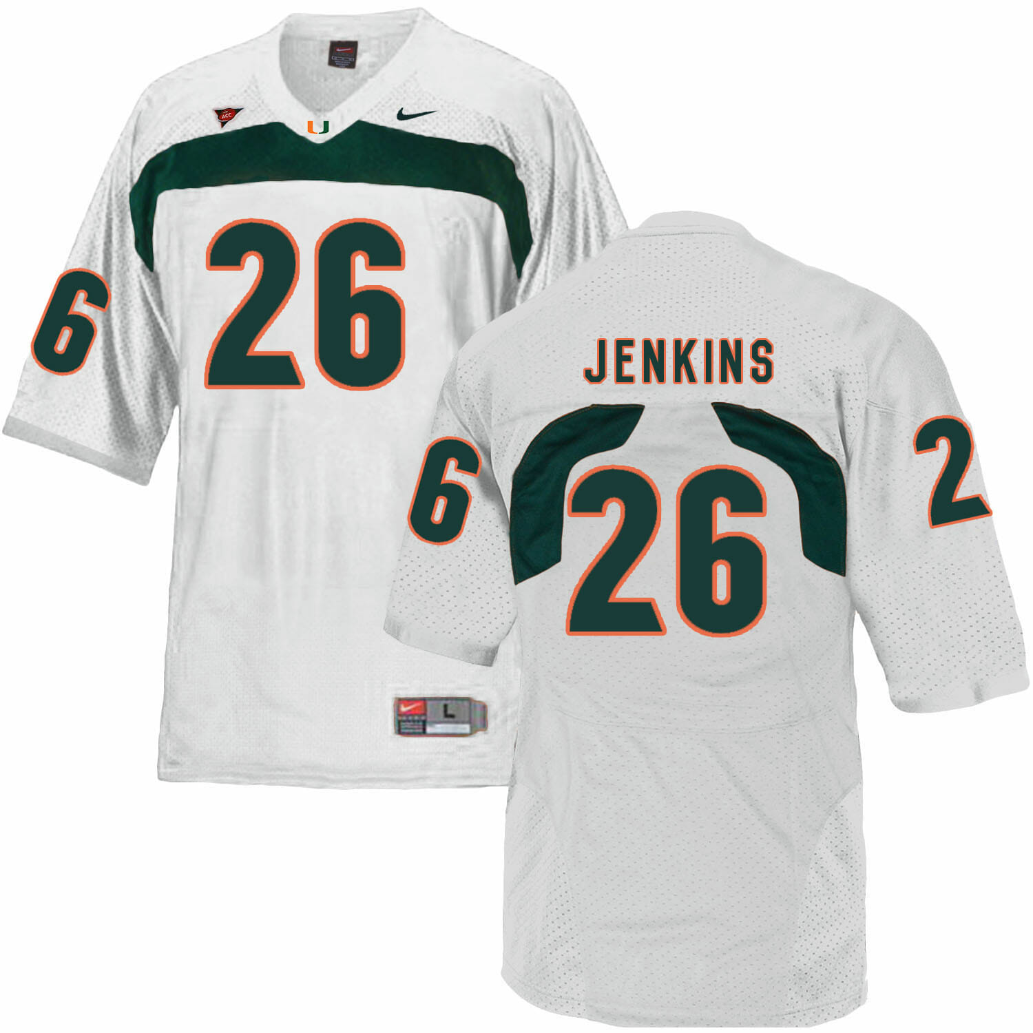 Celebrate your football fandom with this ncaa football jersey ! This Miami Hurricanes #26 Jenkins NCAA College Football Jersey White is available in various size men, women and youth and features a combination of stitched-embroidery. You’ll look just like your favorite ncaa football players when you rock this ncaa football jersey!