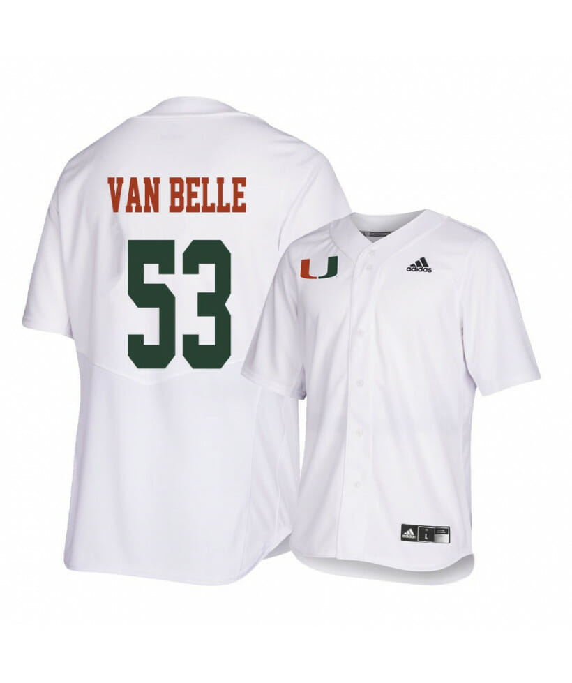 Make sure you are ready to celebrate another baseball team victory on game day! This Miami Hurricanes 53 Brian Van Belle White College Baseball Jersey is available in various size and gender men, women, and youth baseball jersey size and is a perfect way to let you join in on the fun. It boasts quality team colors and graphics so you can feel just like a true baseball team and show off your fandom!