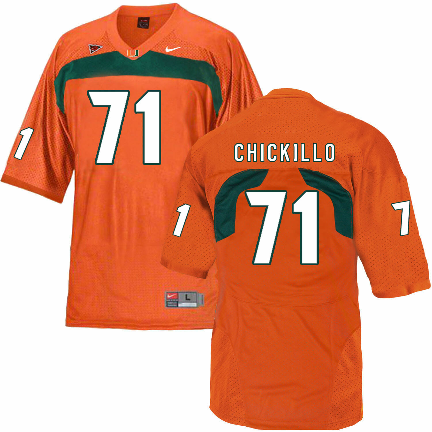 Celebrate your football fandom with this ncaa football jersey ! This Miami Hurricanes #71 Chickillo NCAA College Football Jersey Orange is available in various size men, women and youth and features a combination of stitched-embroidery. You’ll look just like your favorite ncaa football players when you rock this ncaa football jersey!