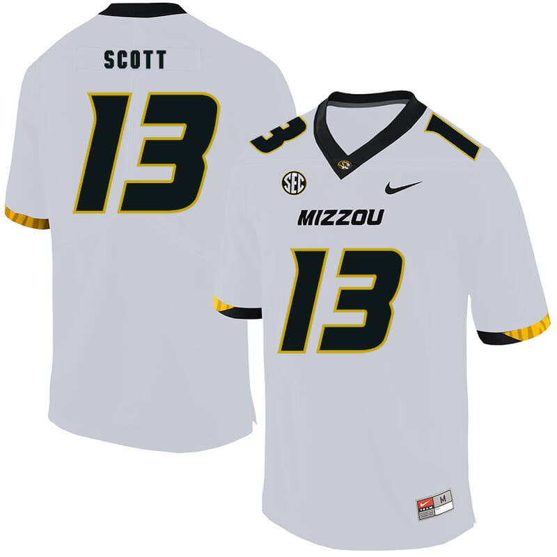 Celebrate your football fandom with this ncaa football jersey ! This Missouri Tigers #13 Kam Scott NCAA College Football Jersey White is available in various size men, women and youth and features a combination of stitched-embroidery. You’ll look just like your favorite ncaa football players when you rock this ncaa football jersey!