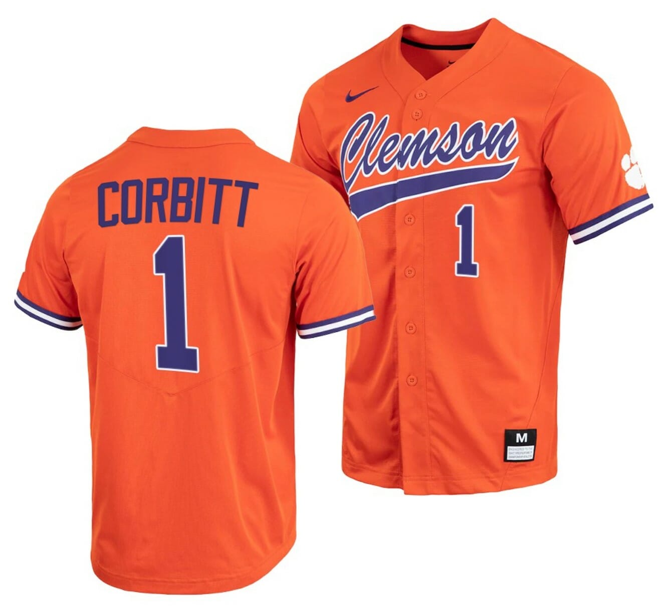 The Tyler Corbitt jersey is a Clemson Tigers College Baseball Orange Full-Button #1 jersey, made from high-quality 100% Polyester material that is designed to wick away moisture and keep the wearer cool and dry during games or other activities. The jersey features an embroidered fabric applique with the Clemson Tigers logo on the front, as well as the player’s name and number on the back. The full-button front and short sleeve design make it a classic and versatile jersey that can be worn by fans of all ages.