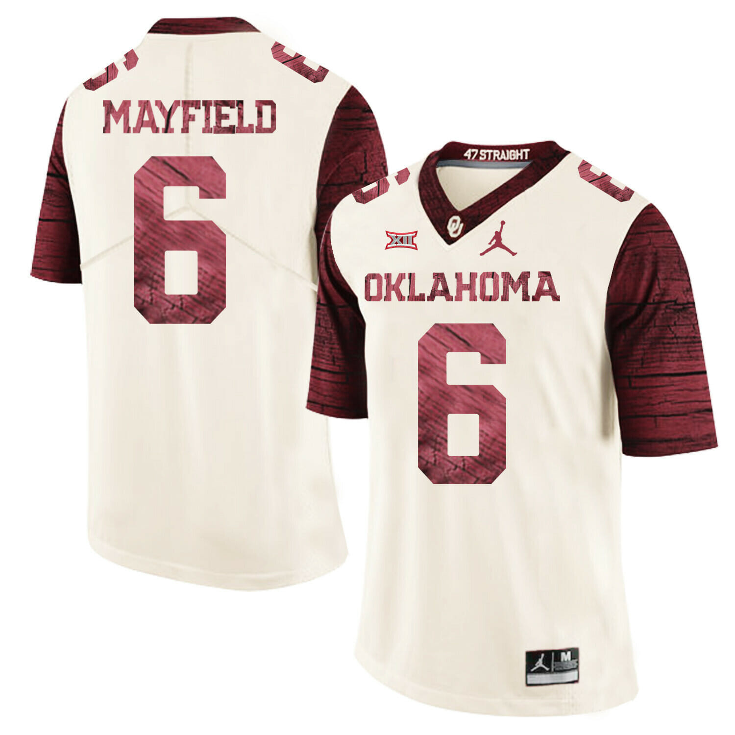Celebrate your football fandom with this ncaa football jersey ! This Oklahoma Sooners #6 Baker Mayfield Firewood Pattern White NCAA College Football Jersey is available in various size men, women and youth and features a combination of stitched-embroidery. You’ll look just like your favorite ncaa football players when you rock this ncaa football jersey!