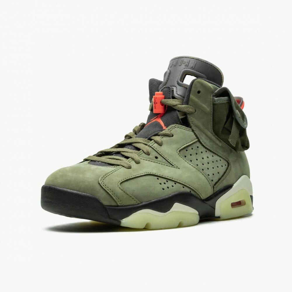 The Travis Scott x Air Jordan 6 Retro “Olive” marks the third time the world famous rapper and Jordan Brand have partnered on an Air Jordan. Scott revisits earth tones as the central theme of the “Cactus Jack” Air Jordan 6, just as he did with his first collaboration on both the high and low top Air Jordan 1 models. The upper part of the sneaker is comprised of an olive-based nubuck material with black detailing and contrasting red accents. An added stash pouch on the collar is reminiscent of the kinds of pockets that can be found on the side of cargo pants and military gear. A black mudguard and Sail midsole with glow-in-the-dark translucent outsole round of the rest of the impressive design.