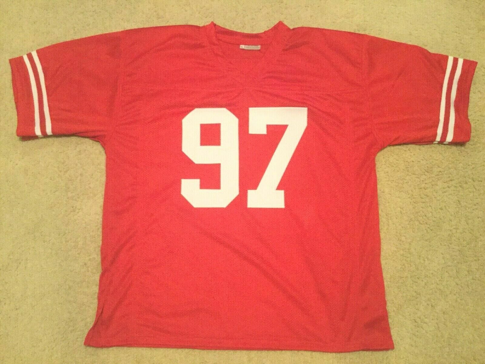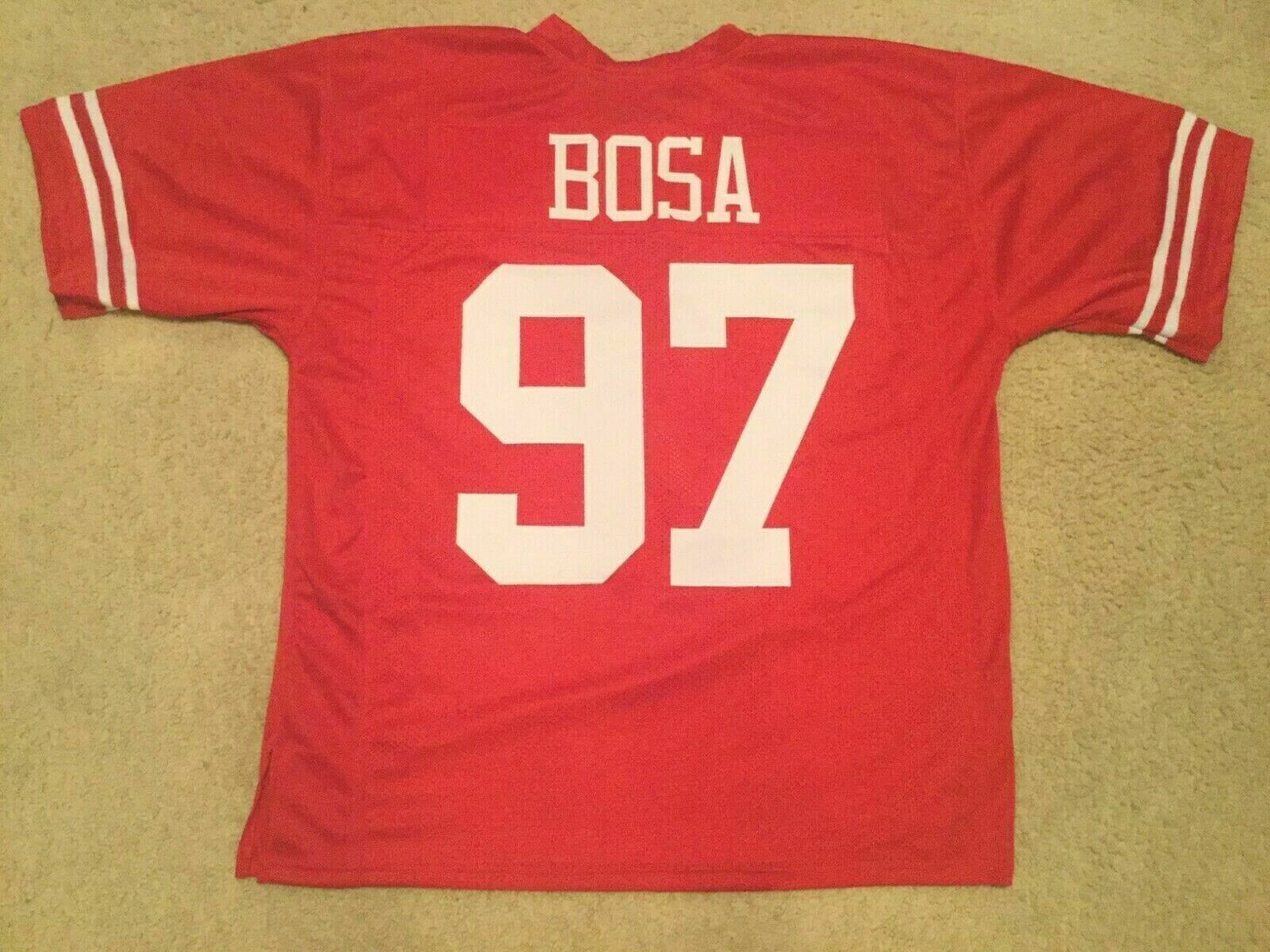Celebrate your football fandom with this football jersey ! This UNSIGNED CUSTOM Sewn Stitched Nick Bosa Red Jersey is available in various size men and features a combination of stitched-embroidery. You’ll look just like your favorite football players when you rock this football jersey!
