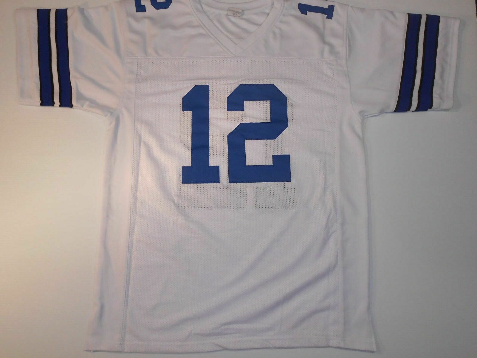 Celebrate your football fandom with this football jersey ! This UNSIGNED CUSTOM Sewn Stitched Roger Staubach White Jersey is available in various size men and features a combination of stitched-embroidery. You’ll look just like your favorite football players when you rock this football jersey!