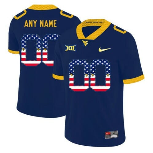 The Personalized WVU Football Jersey Navy USA Flag College feature stitched embroidery and are available in a variety of sizes for men, women and youth. Show off your football fandom with this NCAA college custom football jersey! This NCAA football Personalized WVU Football Jersey will make you look like your favorite NCAA college football players!