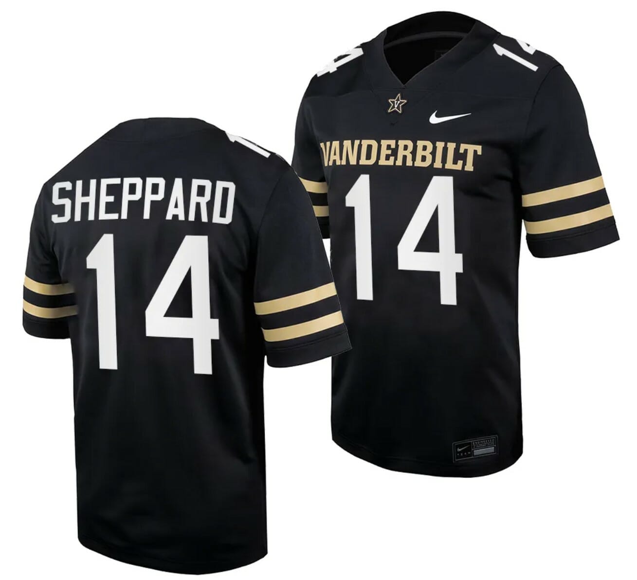 This stunning piece is available in the iconic black hue, a color that signifies determination, power, and dominance on the field. The jersey proudly features the number 14, representing the indomitable Will Sheppard, a player who has left an indelible mark on the Vanderbilt Commodores legacy.