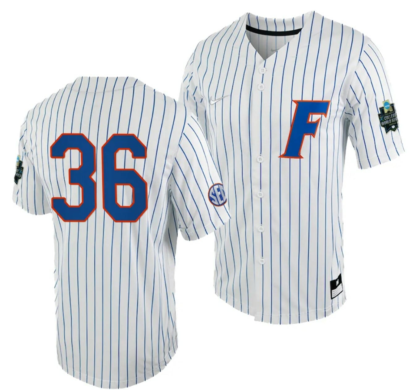 The Wyatt Langford Jersey is a baseball jersey that pays tribute to the talent and dedication of Wyatt Langford. This white jersey, prominently featuring the Florida Gators logo, captures the essence of the team’s spirit and creates a sense of unity among fans. With its royal blue accents and the number 36 boldly displayed on the back, this jersey stands out in any crowd, proudly representing the Florida Gators in the 2023 College World Series.